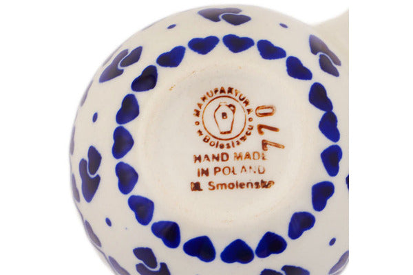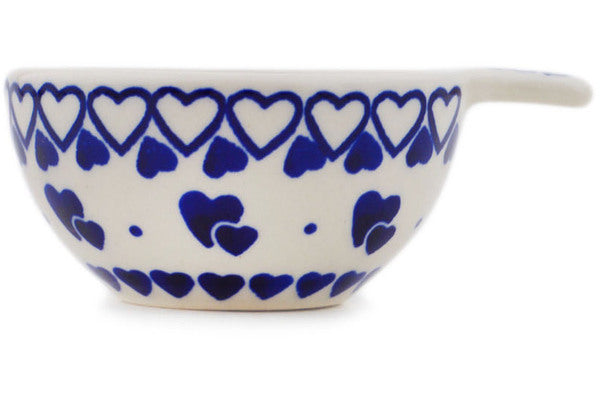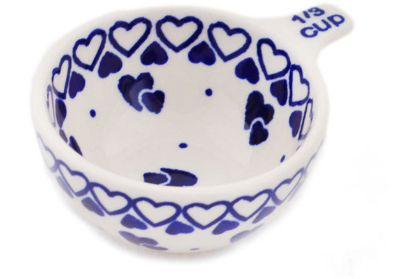 This Polish Pottery Measuring Cup is handmade and handpainted by the Manufaktura factory in Boleslawiec, Poland. Manufacturer item number H8224Q. It is 1½" high and measures 3¾" by 3". The capacity of this Measuring Cup is 2.37 oz (brimful) and it weighs 0.2 lbs. It is part of the Heart To Heart Collection.