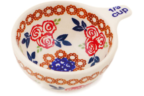 This Polish Pottery Measuring Cup is handmade and handpainted by the Manufaktura factory in Boleslawiec, Poland. Manufacturer item number H8216Q. It is 1½" high and measures 3¾" by 3". The capacity of this Measuring Cup is 2.37 oz (brimful) and it weighs 0.2 lbs. It is part of the Radiant Roses Collection.