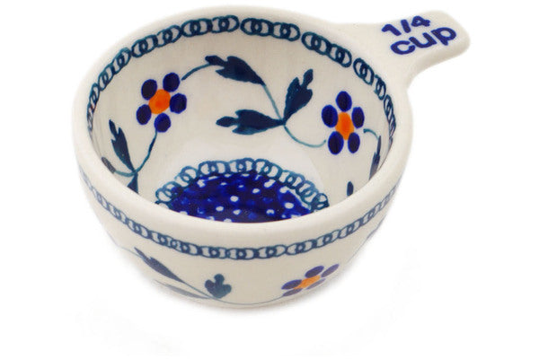 This Polish Pottery Measuring Cup is handmade and handpainted by the Manufaktura factory in Boleslawiec, Poland. Manufacturer item number H8185Q. It is 1½" high and measures 3½" by 2½". The capacity of this Measuring Cup is 1.83 oz (brimful) and it weighs 0.2 lbs. It is part of the Happy Day Collection.