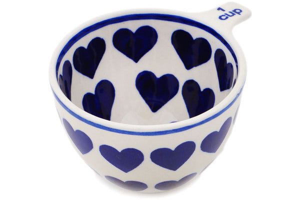This Polish Pottery Measuring Cup is handmade and handpainted by the Manufaktura factory in Boleslawiec, Poland. Manufacturer item number H8279Q. It is 2½" high and measures 4¾" by 3¾". The capacity of this Measuring Cup is 8.39 oz (brimful) and it weighs 0.4 lbs. It is part of the Surrounded By Love Collection.