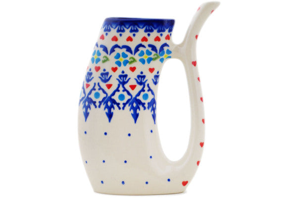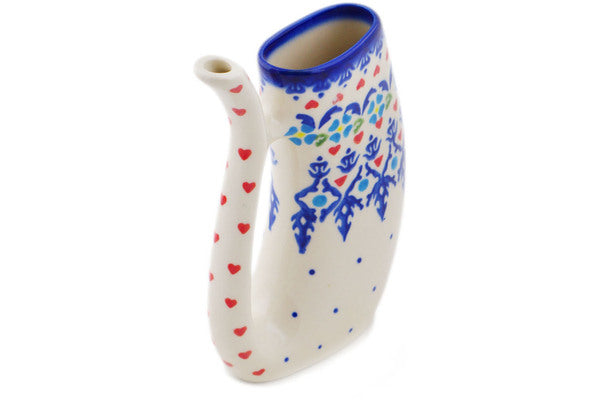 This Polish Pottery Sipper Mug is handmade and handpainted by the Ceramika Bona factory in Boleslawiec, Poland. Manufacturer item number H0155Q. It is 6¼" high and measures 4¾" by 1½". The capacity of this Sipper Mug is 10.14 oz (brimful) and it weighs 0.6 lbs. It is part of the Graphic Armor Collection.
