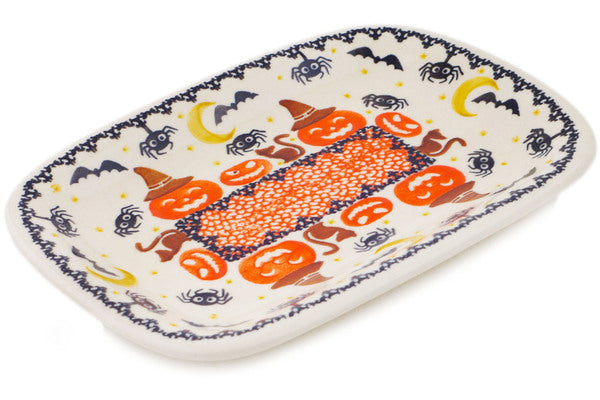 This Polish Pottery Platter is handmade and handpainted by the Ceramika Bona factory in Boleslawiec, Poland. Manufacturer item number H2570P. It is ¾" high and measures 9¾" by 7". The weight of this Platter is 1.4 lbs. It is part of the Halloween Spooky Pumpkin Collection.