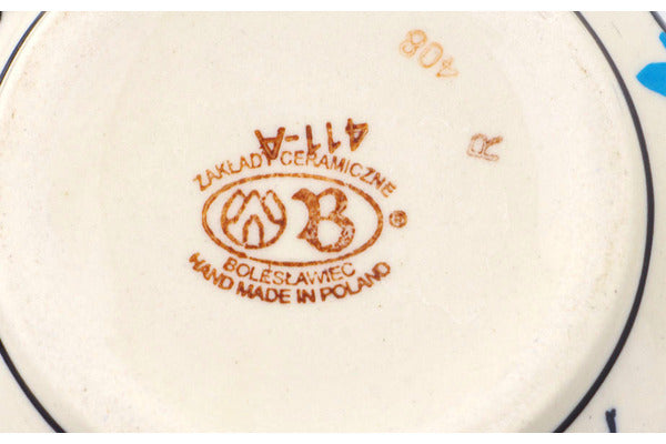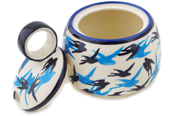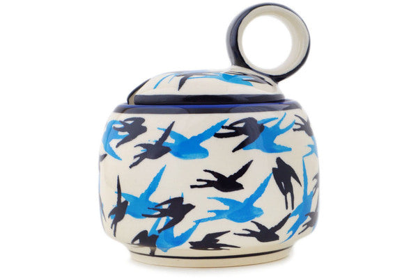 This Polish Pottery Sugar Bowl is handmade and handpainted by the Zaklady Ceramiczne factory in Boleslawiec, Poland. Manufacturer item number H4537N. It is 4¾" high and measures 4¼" by 4¼". The capacity of this Sugar Bowl is 11.36 oz (brimful) and it weighs 1.0 lbs. It is part of the Flocking Collection.