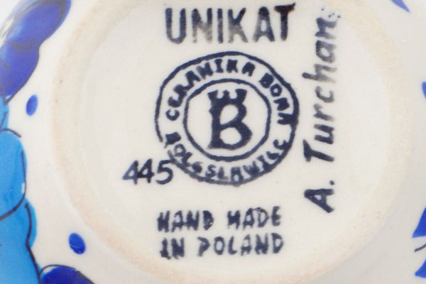 This is a Polish pottery Unikat (Signature) Bubble Mug, which means that it has been hand painted with both sponges and brushes and it is signed by the artist who painted it. Unikat pieces are the most intricate works of art. Larger Unikat items take hours of very careful work to finish.