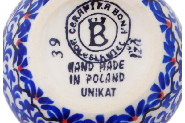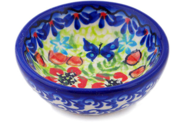 This Polish Pottery Bowl is handmade and handpainted by the Ceramika Bona factory in Boleslawiec, Poland. Manufacturer item number H8759Q. It is 1" high and measures 3" by 3". The capacity of this Bowl is 1.22 oz (brimful) and it weighs 0.2 lbs. It is part of the Metamorphosis Collection.