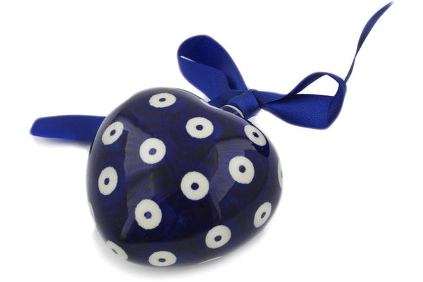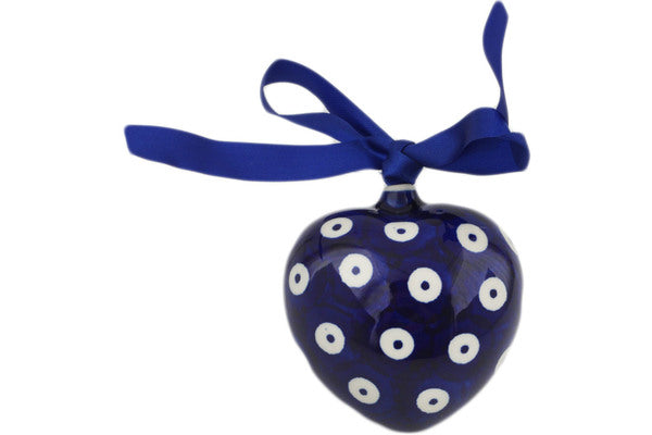 This Polish Pottery Ornament Heart is handmade and handpainted by the Manufaktura factory in Boleslawiec, Poland. Manufacturer item number H7573K. It is 1¾" high and measures 3" by 2½". The weight of this Ornament Heart is 0.1 lbs. It is part of the Peacock Eyes Collection.