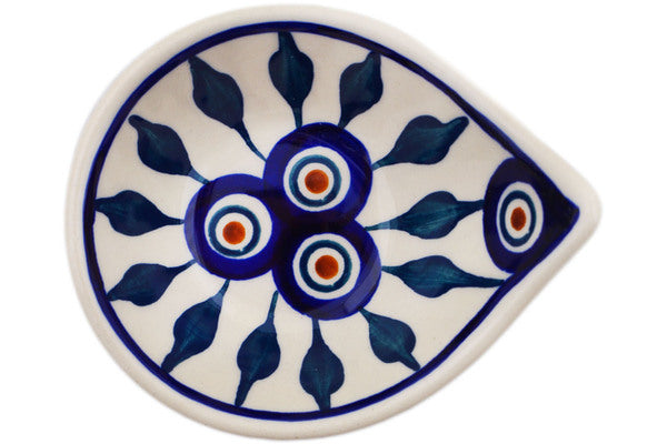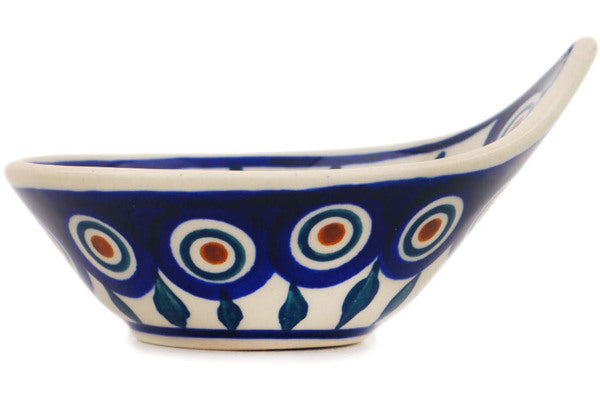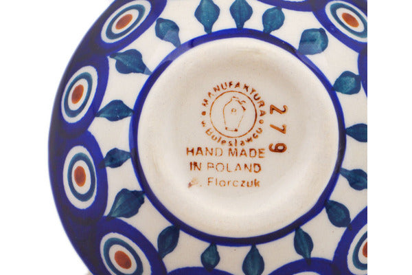 This Polish Pottery Bowl is handmade and handpainted by the Manufaktura factory in Boleslawiec, Poland. Manufacturer item number H8559P. It is 2¼" high and measures 4" by 3¼". The capacity of this Bowl is 2.10 oz (brimful) and it weighs 0.2 lbs. It is part of the Peacock Leaves Collection.