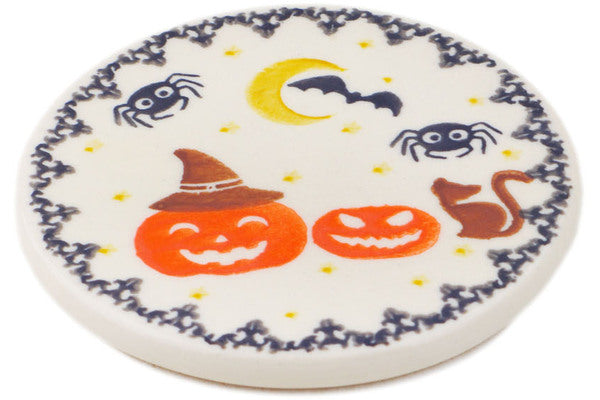 This Polish Pottery Coaster is handmade and handpainted by the Ceramika Bona factory in Boleslawiec, Poland. Manufacturer item number H5003P. It is ¼" high and measures 4½" by 4½". The weight of this Coaster is 0.4 lbs. It is part of the Halloween Spooky Pumpkin Collection.