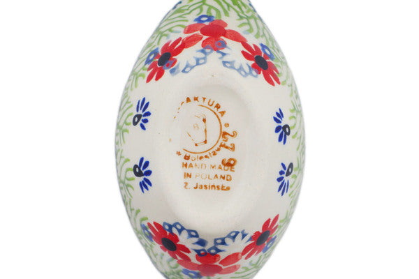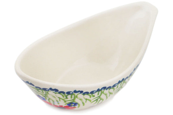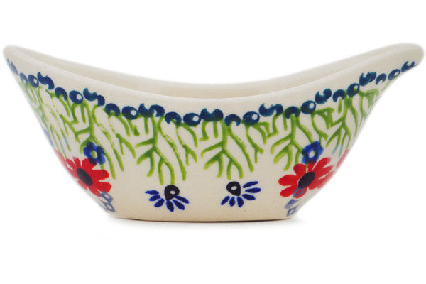 This Polish Pottery Bowl is handmade and handpainted by the Manufaktura factory in Boleslawiec, Poland. Manufacturer item number H7482P. It is 2" high and measures 4½" by 2¾". The capacity of this Bowl is 2.64 oz (brimful) and it weighs 0.3 lbs. It is part of the Red Blossom Collection.