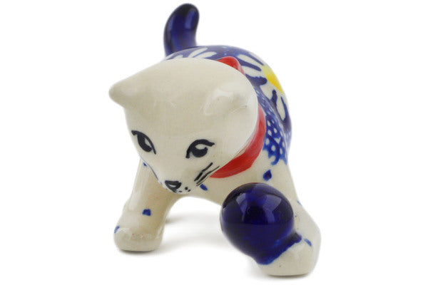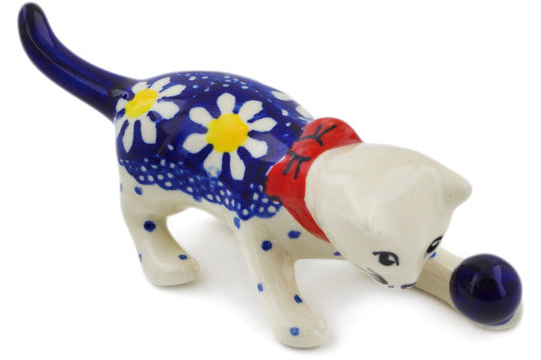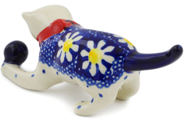 This Polish Pottery Cat Figurine is handmade and handpainted by the Manufaktura factory in Boleslawiec, Poland. Manufacturer item number H3299K. It is 2" high and measures 5¼" by 1¾". The weight of this Cat Figurine is 0.2 lbs. It is part of the Daisy Collection.