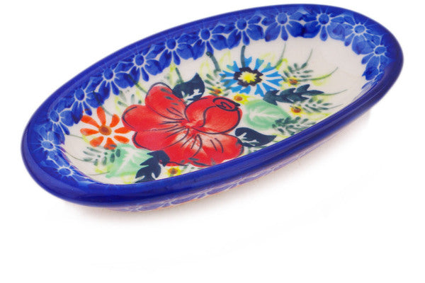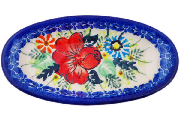 This Polish Pottery Condiment Dish is handmade and handpainted by the Ceramika Bona factory in Boleslawiec, Poland. Manufacturer item number H3889Q. It is 1" high and measures 5¾" by 2¾". The capacity of this Condiment Dish is 3.38 oz (brimful) and it weighs 0.3 lbs. It is part of the Bold Poppies Collection.