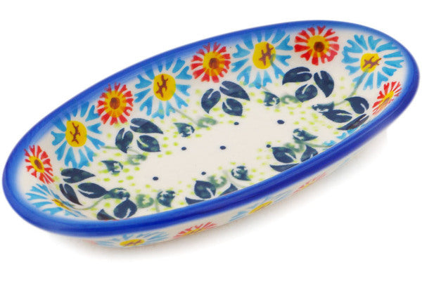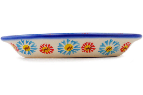 This Polish Pottery Condiment Dish is handmade and handpainted by the Ceramika Bona factory in Boleslawiec, Poland. Manufacturer item number H2129R. It is 1" high and measures 5¾" by 2¾". The capacity of this Condiment Dish is 3.38 oz (brimful) and it weighs 0.3 lbs. It is part of the Long-stemmed Beauties Collection.