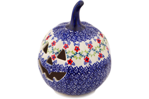 This Polish Pottery Jack O Lantern Candle Holder is handmade and handpainted by the Manufaktura factory in Boleslawiec, Poland. Manufacturer item number H8413Q. It is 5½" high and measures 6" by 5¾". The weight of this Jack O Lantern Candle Holder is 1.5 lbs. It is part of the Rings Of Happiness Collection.