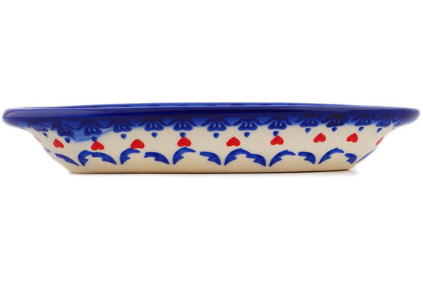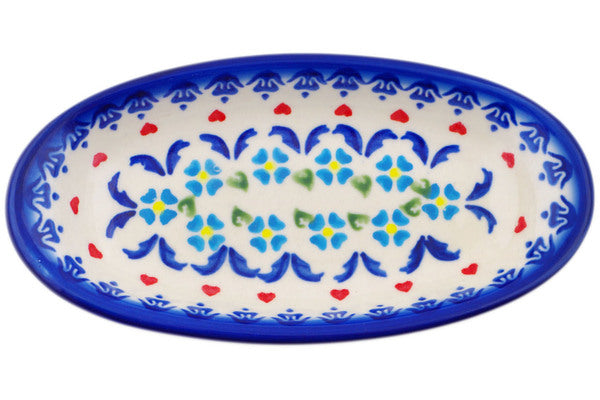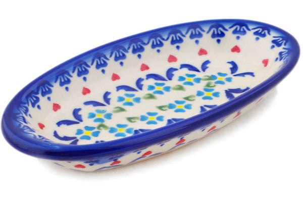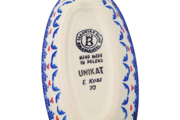 This Polish Pottery Condiment Dish is handmade and handpainted by the Ceramika Bona factory in Boleslawiec, Poland. Manufacturer item number H0113Q. It is 1¼" high and measures 7¼" by 3¾". The capacity of this Condiment Dish is 5.58 oz (brimful) and it weighs 0.5 lbs. It is part of the Graphic Armor Collection.