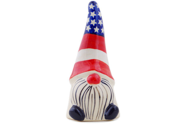This Polish Pottery Gnome Figurine is handmade and handpainted by the Ceramika Bona factory in Boleslawiec, Poland. Manufacturer item number H2103R. It is 7¼" high and measures 3¼" by 2¾". The weight of this Gnome Figurine is 0.7 lbs. It is part of the Stars And Stripes Collection.