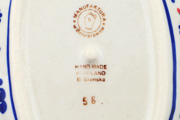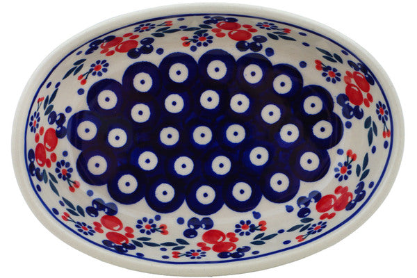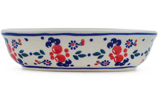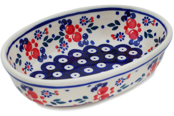 This Polish Pottery Oval Baker is handmade and handpainted by the Manufaktura factory in Boleslawiec, Poland. Manufacturer item number H9119P. It is 1¾" high and measures 7" by 5". The capacity of this Oval Baker is 13.86 oz (brimful) and it weighs 0.8 lbs. It is part of the Burst Of Berries Collection.