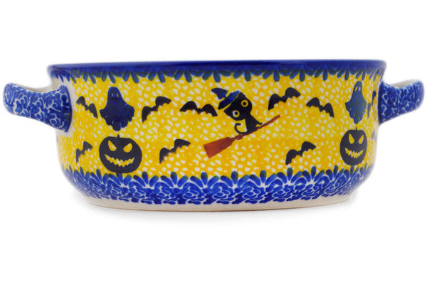 This Polish Pottery Round Baker with Handles is handmade and handpainted by the Ceramika Nina factory in Boleslawiec, Poland. Manufacturer item number H3388P. It is 2¾" high and measures 8¼" by 6½". The capacity of this Round Baker with Handles is 30.77 oz (brimful) and it weighs 1.3 lbs. It is part of the Halloween Evening Collection.